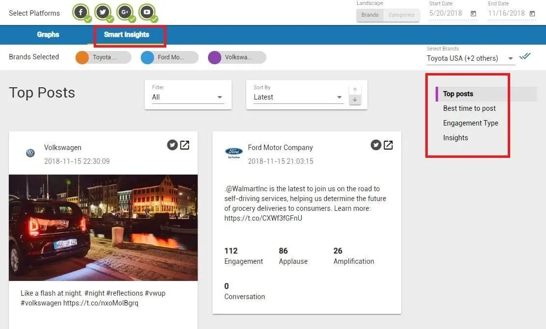 Vaizle is the only tool that will give you analytics on all of the key players (Twitter, Facebook, YouTube, and Instagram) and let you tailor-make your reports.