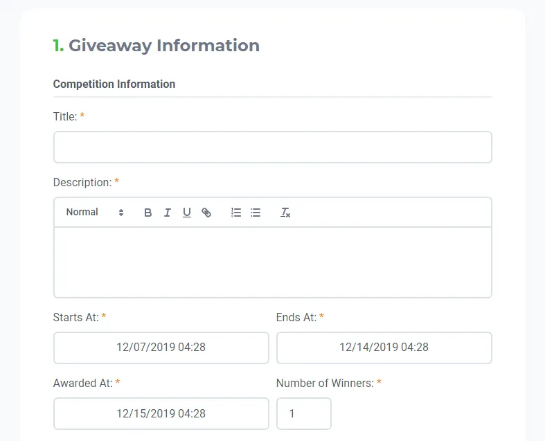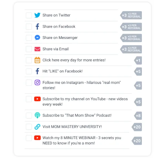 E.g; you’ll be able to give away 10 bonus entries if someone follows your Twitter handle, clicks a link to your website, subscribes to your podcast, or takes a handful of other actions!